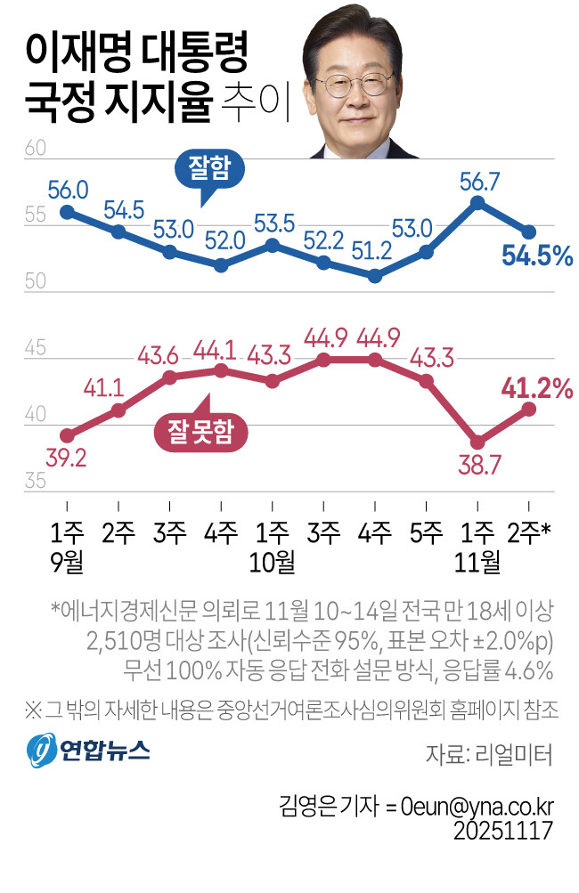 17일 공개된 리얼미터 조사(에너지경제신문 의뢰·10~14일 실시)에 따르면 이 대통령 국정수행에 대한 긍정평가는 54.5%, 부정평가는 41.2%로 집계됐다. 긍정 평가는 2주 연속 상승 흐름을 보이다 이번 조사에서 하락 전환했다.