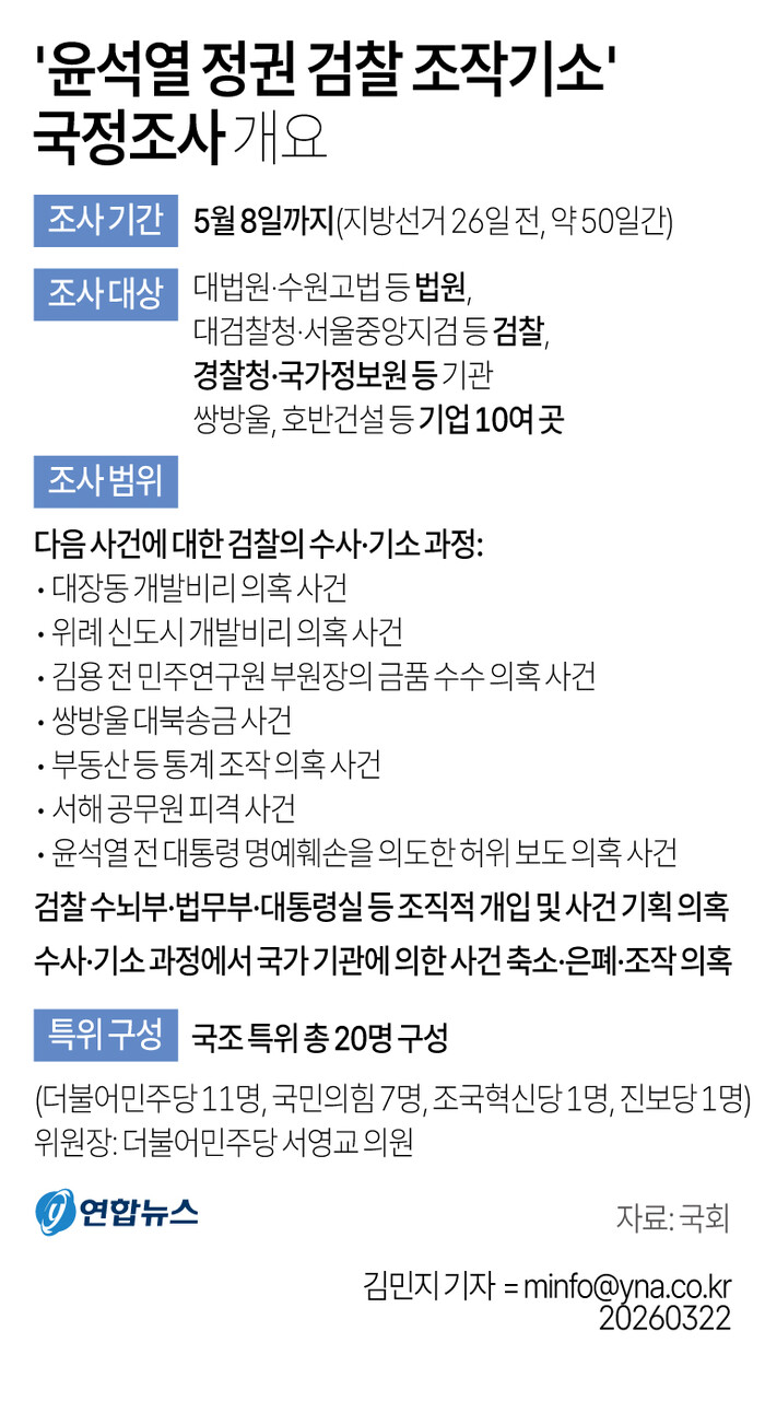 더불어민주당 주도로 통과된 ‘윤석열 정권 정치검찰 조작기소 의혹사건 진상규명 국정조사’는 오는 5월 8일까지 50일간 진행된다. 대장동·위례 사건, 김용 전 민주연구원 부원장 사건, 쌍방울 대북송금 사건 등 수사 과정 전반에 대한 국가기관 개입 여부를 조사하는 것이 핵심이다.