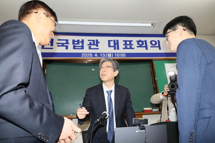 ▲ 경기 고양 사법연수원에서 열린 전국법관대표회의에서 참석자들이 심각하게 대화하고 있다. 2026.4.13 (사진=연합뉴스)