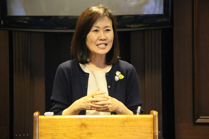 ▲ 워싱턴DC 공화당 전국위원회(RNC) 본부에서 가진 한국 특파원들과의 간담회에서 당시 미셸 박 스틸(한국명 박은주) 캘리포니아 주(州) 오렌지 카운티의 첫 한인 수퍼바이저위원회 부위원장이 공화당의 사실상 대선후보인 도널드 트럼프와 한국의 가교 역할에 대한 입장을 밝히는 모습. 2026.4.14 (사진=연합뉴스)