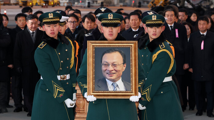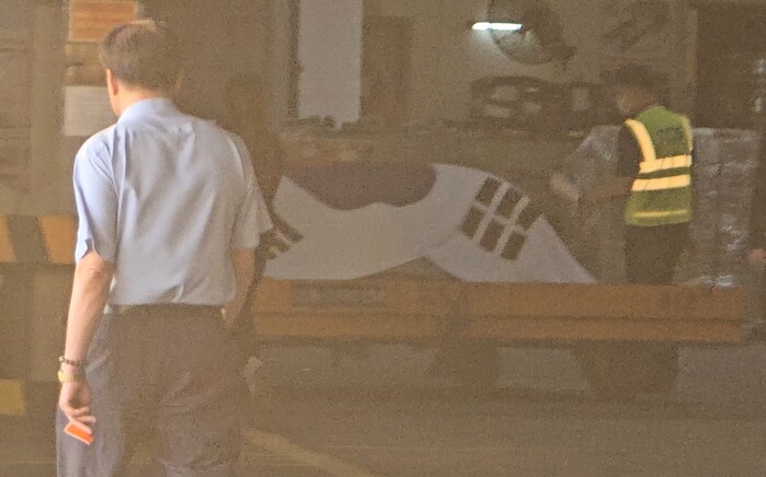 | ▲ 26일(현지시간) 베트남 호찌민시 떤선 국제공항에 도착한 이해찬 민주평화통일자문회의 수석부의장의 관이 대형 태극기에 감싸인 채 공항 내부로 옮겨지고 있다. 2026.1.26 (사진=연합뉴스) |