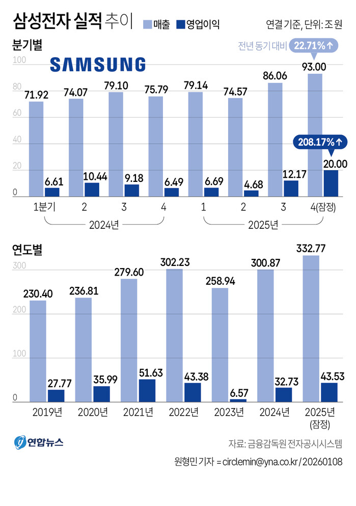 삼성전자는 8일 공시를 통해 지난해 4분기 연결 기준 매출 93조원, 영업이익 20조원을 잠정 집계했다고 밝혔다. 매출은 전년 동기 대비 22.7%, 전 분기 대비 8.1% 증가했고, 영업이익은 전년 동기 대비 208.2%, 전 분기 대비 64.3% 급증했다. 시장 전망치(약 19조6천억원)도 웃돌았다.