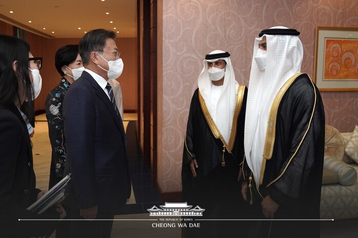 문재인 대통령은 15일 오후 6시 40분 경(현지시각), 약 12시간의 비행을 마치고 두바이 왕실공항에 도착했다. 문 대통령 부부는 수하일 모하메드 알 마즈로이 에너지인프라부 장관, 압둘라 사이프 알누아이미 주한UAE 대사의 환영을 받았다.