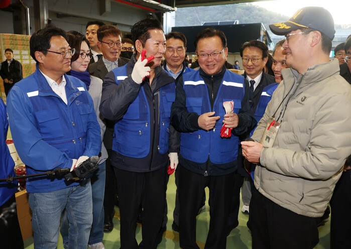 정청래 더불어민주당 대표가 8일 새벽 김부겸 대구시장 예비후보와 함께 대구농수산물도매시장을 찾아 민생 현장 행보에 나섰다. 민주당이 전통적 약세 지역인 대구에서 본격적인 외연 확장 전략에 돌입했다는 해석이 나온다.