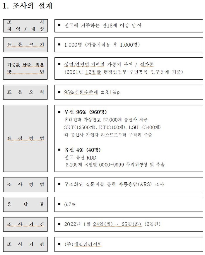 -휴대전화 가상번호96%,유선전화 RDD4%.최종응답률6.7%,표본오차95%,±3.1%p.