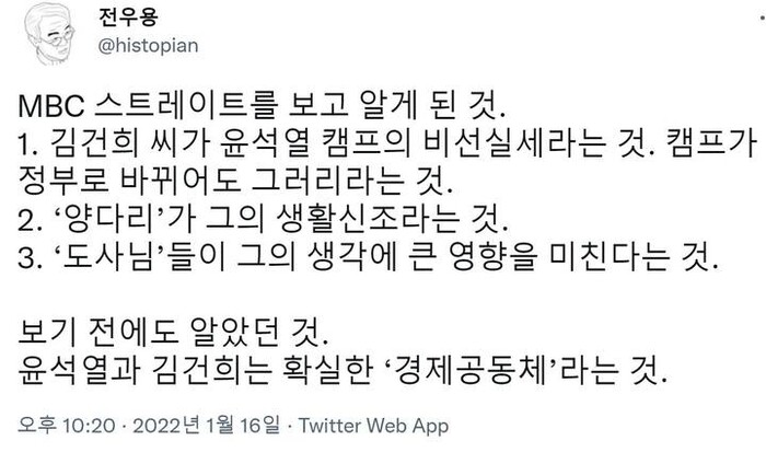 전우용 역사학자는 이날 페이스북을 통해 MBC 스트레이트를 보고 알게 된 것이라며 "김건희 씨가 윤석열 캠프의 비선실세라는 것. 캠프가 정부로 바뀌어도 그러리라는 것. ‘양다리’가 그의 생활신조라는 것. ‘도사님’들이 그의 생각에 큰 영향을 미친다는 것.보기 전에도 알았던 것. 윤석열과 김건희는 확실한 ‘경제공동체’라는 것"이라고 3가지 항목을 꼽았다.