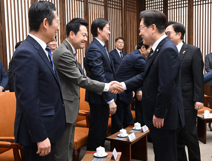 | ▲ 이재명 대통령이 2일 추가경정예산안 시정연설에 앞서 국회의장 접견실에서 더불어민주당 정청래 대표와 인사하고 있다. 2026.4.2 (사진=연합뉴스) |