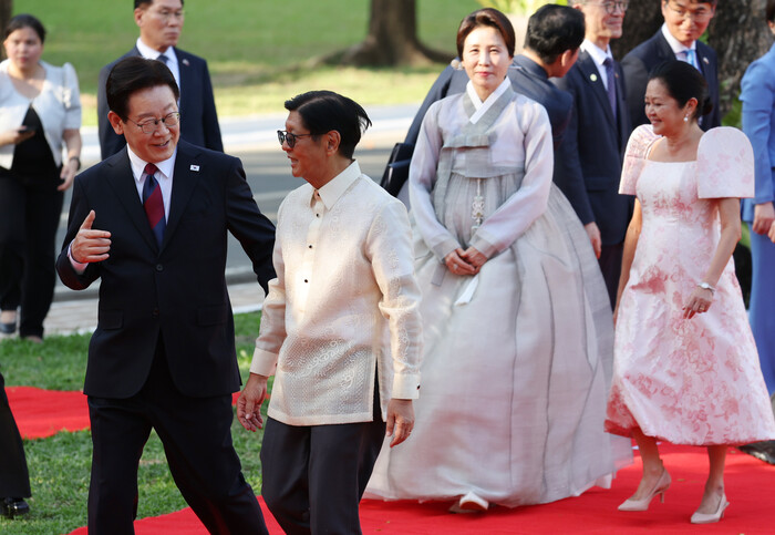| ▲ 이재명 대통령과 김혜경 여사가 3일 필리핀 마닐라 말라카냥궁에서 열린 국빈방문 환영식을 마친 뒤 페르디난드 마르코스 필리핀 대통령, 루이즈 아라네타 마르코스 여사와 함께 건물로 이동하고 있다. 2026.3.3 (사진=연합뉴스) |