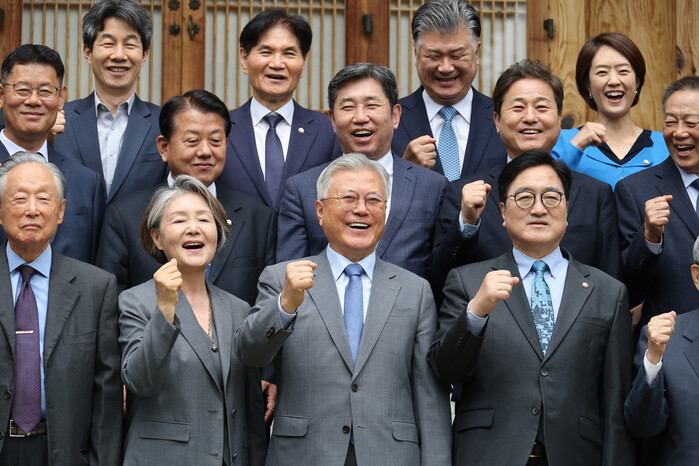 | ▲ 문재인 전 대통령과 김정숙 여사가 27일 4·27 남북 판문점선언 8주년 기념식 참석을 위해 국회를 방문, 우원식 국회의장 등 참석자와 사랑재에서 오찬 뒤 기념 촬영하고 있다. 2026.4.27 (사진=연합뉴스) |