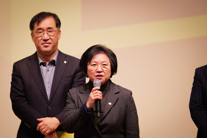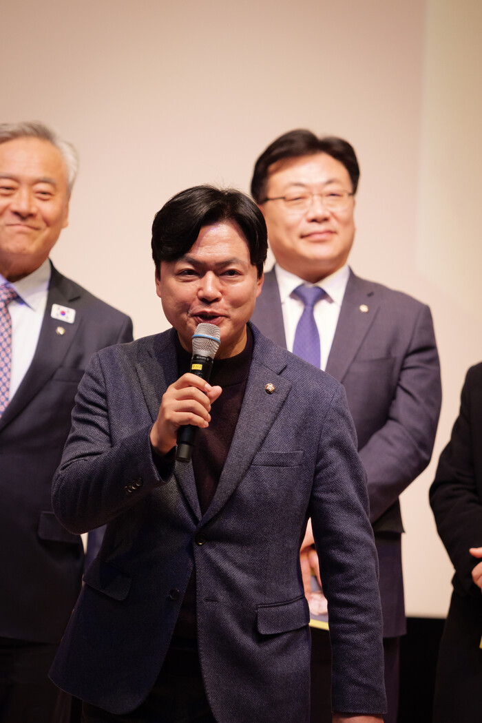 김현 의원이 마이크를 들고 축하 메시지를 전하자 객석에서는 다시 한 번 박수가 터져 나왔다.