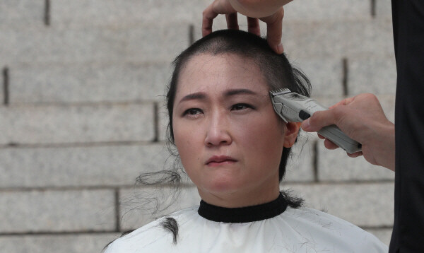 | ▲ 이언주 무소속 의원이 문재인 대통령의 조국 법무부장관 임명에 반발하여 삭발식을 감행했다. 2019.9.10 (사진=연합뉴스) |