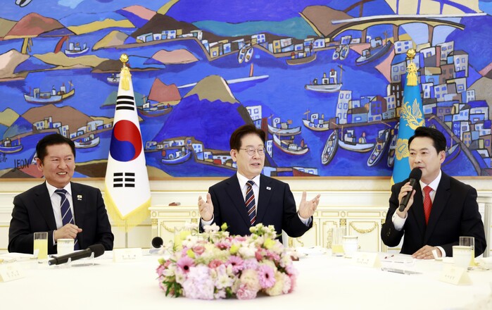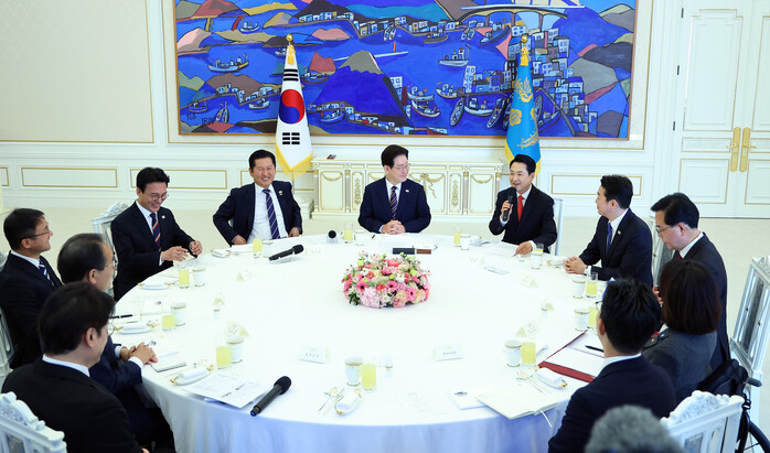 이 대통령은 회담 시작 전 정청래 더불어민주당 대표와 장동혁 국민의힘 대표의 손을 직접 맞잡게 하며 분위기를 풀었다. 파란색과 빨간색이 섞인 넥타이를 착용한 채 “손님 먼저”라며 장 대표에게 첫 발언 기회를 넘기기도 했다.