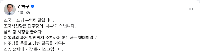 한편 강 최고위원은 조국 대표를 향해 “조국혁신당은 민주당의 내부가 아니다”라고 밝히며 합당 논의와 관련한 입장을 공개적으로 표명했다. 조 대표가 당내 갈등을 지적한 데 대한 반박 성격으로 해석되며, 양측 메시지 충돌이 당내 논쟁을 확대시키는 양상이다.