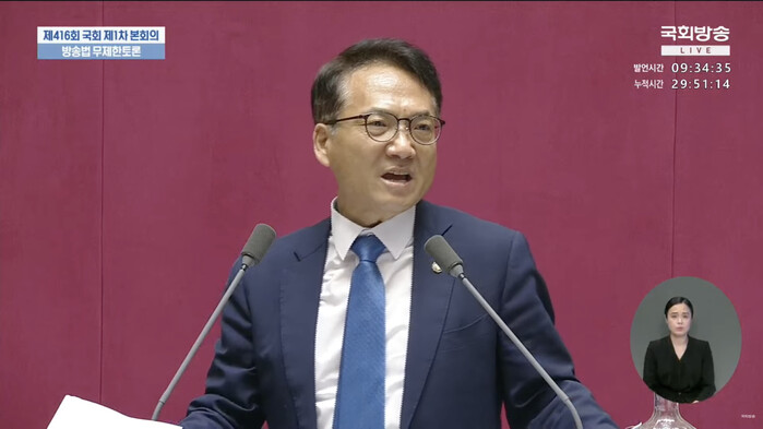 | ▲방송법 본회의 상정 후 필리버스터하는 신동욱 국민의힘 의원 (사진=연합뉴스) |