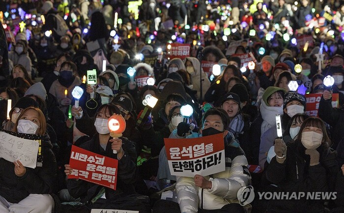 평일에도 식지 않는 열기로, 오늘 집회에는 주최 측 추산 5만명, 경찰 비공식 추산 7000명참가해 형형색색의 응원봉과 촛불 LED를 흔들며 "윤석열 탄핵"을 외쳤다.