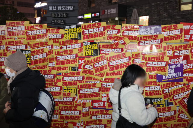 시민들은 국민의힘 중앙당사 앞 방벽에 손피켓 '내란동조 국민의힘 해체하라!'를 붙이기도 했다.