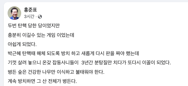 | ▲ 홍준표 전 대구시장의 게시글 (출처=홍준표 페이스북) |