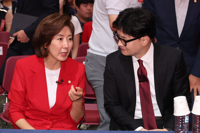 | ▲나경원 한동훈 당대표 후보 대화모습 (사진=연합뉴스) |