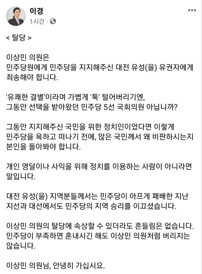 3일 탈당을 선언한 이상민 의원에 민주당이 싸늘한 반응을 나타내는 가운데 이상민 의원의 지역구에서 경선을 준비하는 이경 더불어민주당 상근부대변인이 "대전 유성을 유권자에게 죄송해야 한다"면서 비판했다.