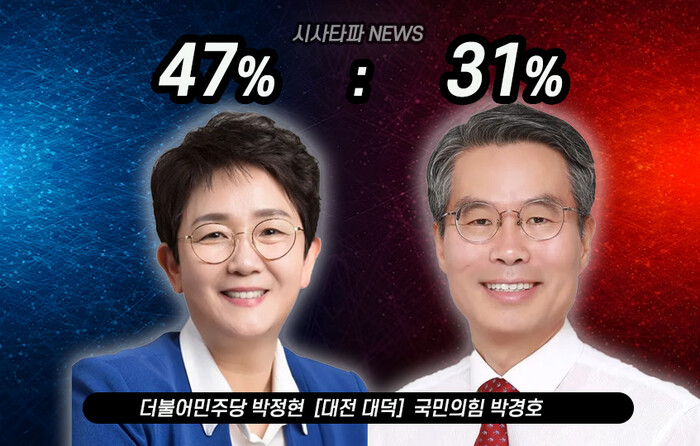 대전 대덕구는 박정현 더불어민주당 후보가 47%, 박경호 국민의힘 후보가 31%를 차지하며 사실상 굳어지는 분위기가 연출되고 있다.