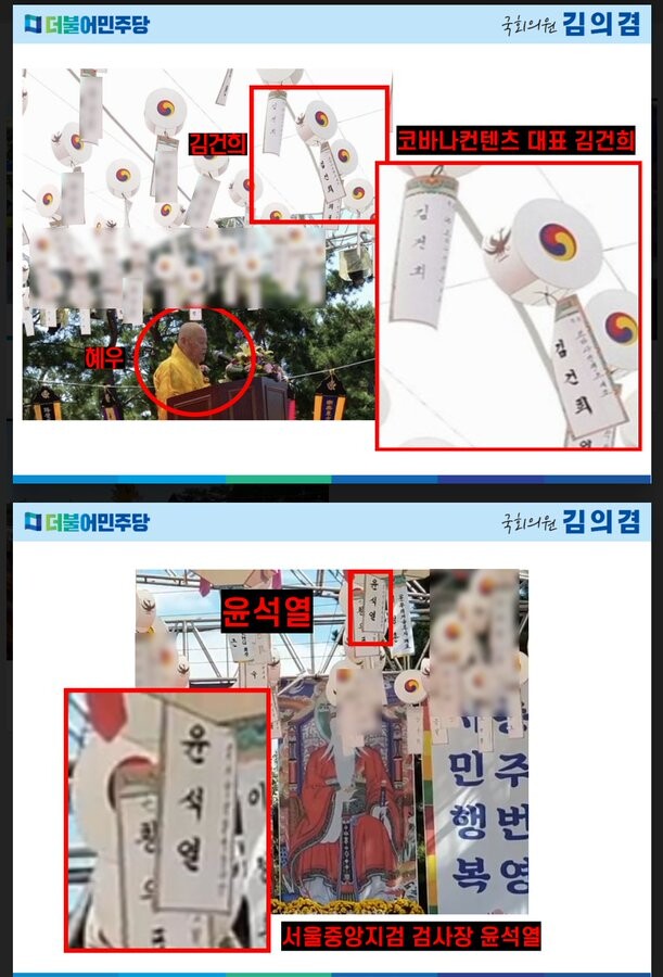 김 의원은 기자회견에서 일광종 종정이자 건진법사 스승인 혜우가 행사 당시 인사말을 하는 머리 위로 ‘코바나컨텐츠 대표 김건희’라는 이름이 적힌 두 개의 등과 그 옆에 나란히 걸려있는 ‘서울중앙지방검찰청 검사장 윤석열’의 이름이 적힌 등의 사진을 공개했다.