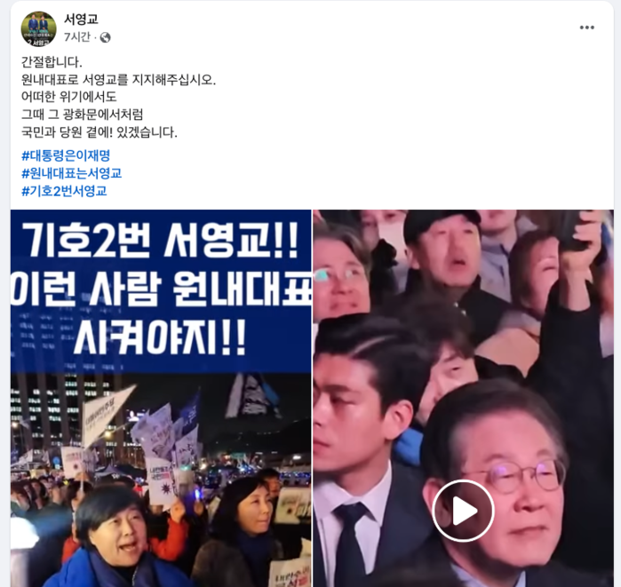 서 의원 역시 페이스북에서 “'서장군'이 돼 이재명 정부 여당으로 힘을 쏟겠다”며 “서장군이 승리를 만들어 내려면 당원 여러분과 국회의원들이 힘을 모아줘야 한다”고 호소했다