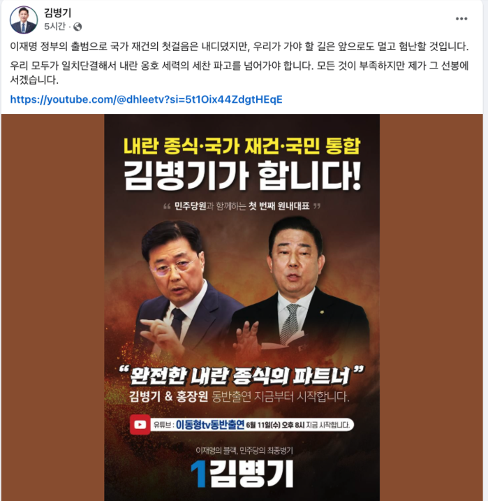 국가정보원 출신인 김 의원은 페이스북을 통해 “이재명 정부 성공을 위한 듬직한 민주당 원내대표”라며 “이재명 정부 성공의 반석이 되겠다”고 말했다.