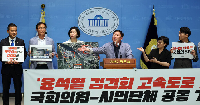 | ▲ 안진걸 민생경제연구소장이 서울-양평 고속도로 관련 국회의원-시민단체 공동회견에서 발언하고 있다.(사진=연합뉴스) |