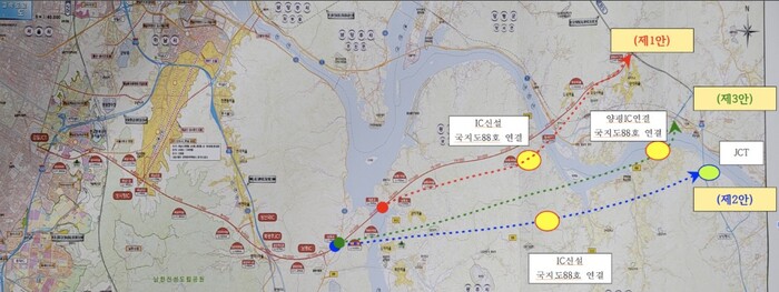 이 중 제1안은 정부가 원래 추진하던 고속도로 노선(종점 양서면), 제2안은 양평군이 새로 추가한 노선(종점 강상면)이며 이때까지는 양평군도 원래의 고속도로 노선을 '1안'으로 국토부에 보냈다.