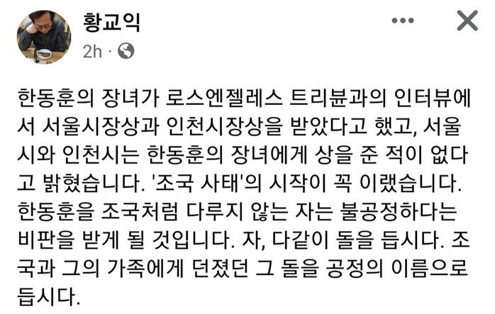 황씨는 이어 "조국의 딸 조민의 허위 스펙을 수사하기 위해 조민이 청소년기에 썼던 일기를 검찰이 압수했다는 말을 듣고 많은 국민이 검찰의 잔인함에 치를 떨고 비난했다"며 "검찰은 한동훈 딸의 일기를 압수해 검찰의 잔인함이 대상을 가리지 않고 집행됨을 국민에게 보여주어야 그나마 검찰이 공정하다는 평가를 얻을 것"이라고 지적했다.