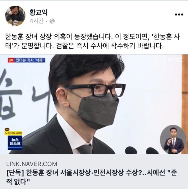 MBC의 오전 취재가 시작되자, 수상 내역들이 소개된 해당 기사는 갑자기 언론사 사이트에서 사라졌다고 보도했다. 이에 “한동훈 사태” 라며 4일 자신의 페이스북에 “검찰은 칼춤을 추라”고 황교익씨는 직격탄을 날렸다.