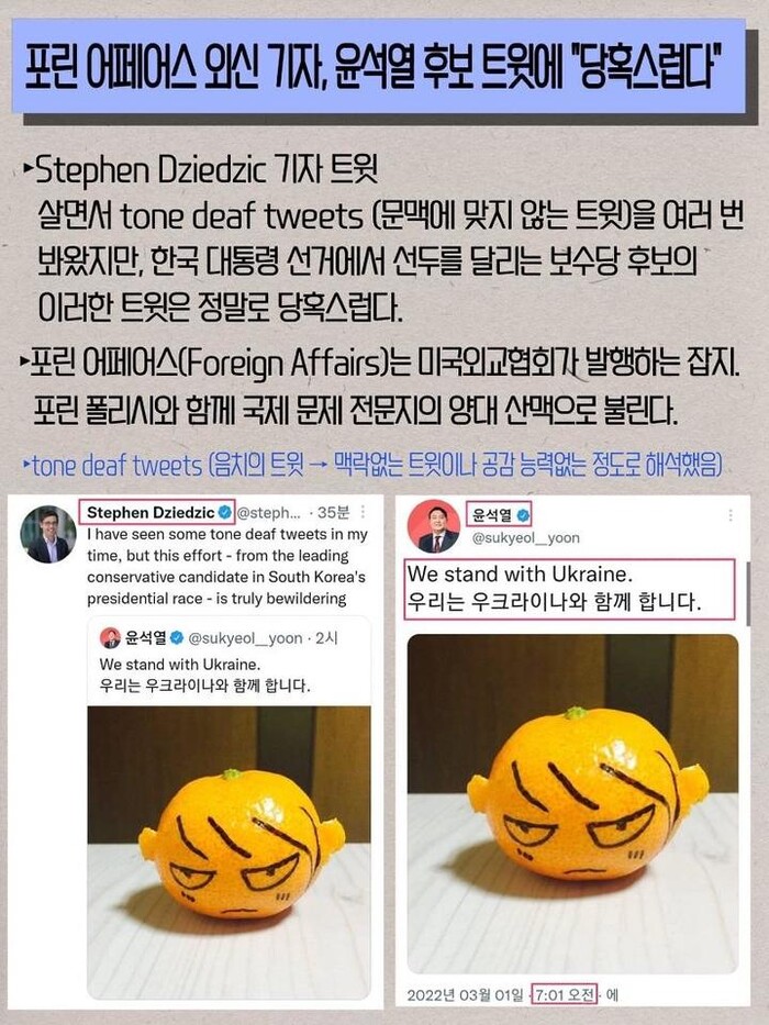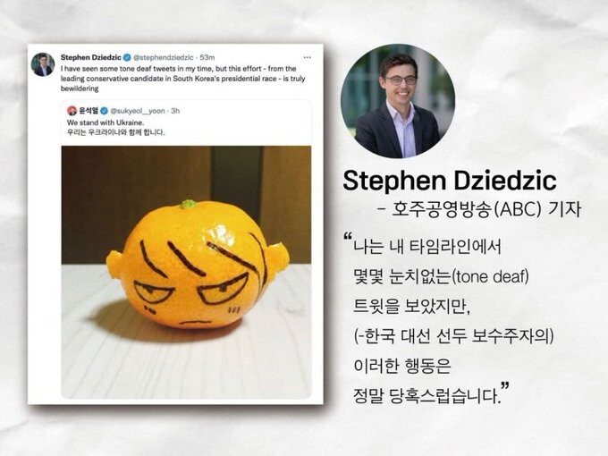 3.1절인 이날, 오전 7시경 윤 후보의 공식 트위터 계정에는 화난 표정을 그려 넣은 귤 사진과 함께 '우리는 우크라이나와 함께 합니다'라는 글이 올라왔다. 현재 해당 게시물은 삭제됐지만, 캡처된 사진이 공유되면서 논란은 계속되고 있다.