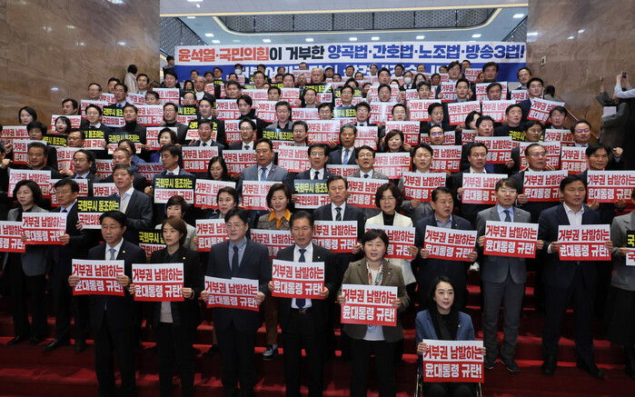 더불어민주당은 노란봉투법과 방송 3법 개정안이 윤석열 대통령의 거부권 행사로 8일 본회의에서 재의에 부쳐졌다가 부결돼 폐기된 것과 관련해 정부·여당을 맹비난했다.