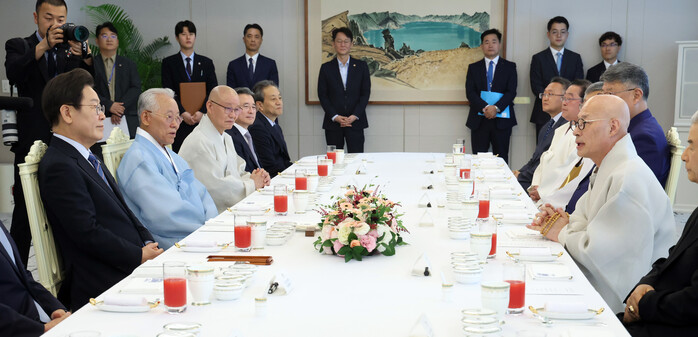 | ▲ 이재명 대통령이 용산 대통령실에서 종교 지도자들과 오찬에 앞서 조계종 총무원장 진우스님의 인사말을 듣고 있다. 2025.7.9 (사진=연합뉴스) |