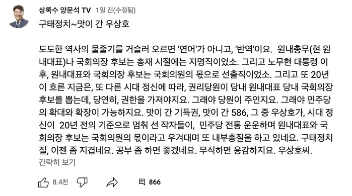 양 당선인은 이날 자신의 유튜브 채널 게시판에 올린 글에서 "시대정신이 20년 전의 기준으로 멈춰 선 작자들이 민주당 전통 운운하며 원내대표와 국회의장 후보는 국회의원의 몫이라고 우겨대며 또 내부 총질을 하고 있다"며 우 의원을 공개 비판했다.