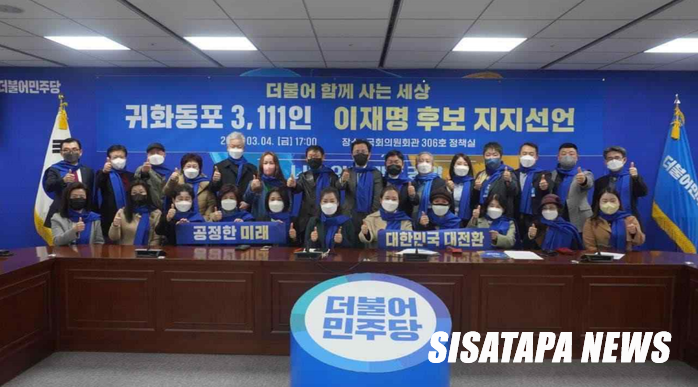 ‘귀화동포 3,111명’이 4일(금) 오후 5시, 국회의원회관 306호 정책위 회의실에서 이재명 더불어민주당 대선 후보를 공식 지지 선언했다. 이번 선언에는 고은희 전 길림대학교 교수, 신운철 사단법인 한중마케팅협회 이사 장 등 30명과 이덕윤 미래혁신위원회 공동위원장, 박옥선 다문화본부장 등이 참석했다.