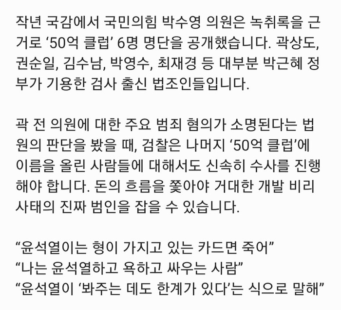 작년 국감에서 국민의힘 박수영 의원은 녹취록을 근거로 ‘50억 클럽’ 6명 명단을 공개했습니다. 곽상도, 권순일, 김수남, 박영수, 최재경 등 대부분 "박근혜 정부가 기용한 검사 출신 법조인" 들입니다.