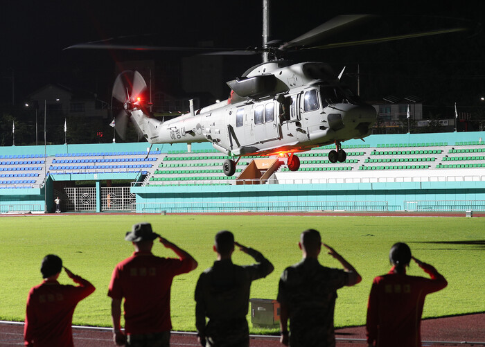 | ▲채 상병 이송 헬기에 경례하는 해병대원들 (사진=연합뉴스) |