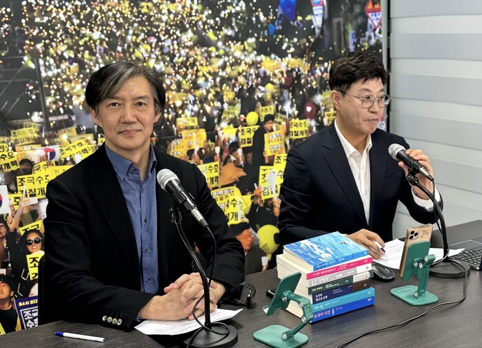 | ▲인터뷰 중인 조국 전 장관과 이종원 PD (사진=시사타파뉴스 곽동수) |