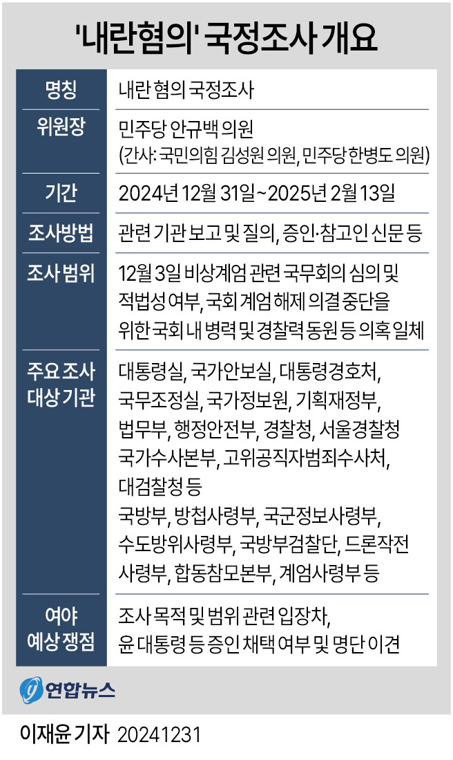 조사 범위는 비상계엄 선포 전 사전 모의 여부, 국무회의 심의 여부와 적법성, 주요 정치인 등 체포조 운용 의혹, 국회 계엄 해제 의결 중단을 위한 국회 내 병력 및 경찰력 동원 의혹 등 비상계엄과 관련한 의혹 전반이다.