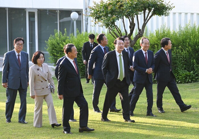 | ▲국민의힘 비대위원들과 산책하는 윤석열 대통령 (사진=연합뉴스) |