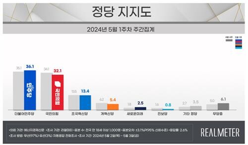 지난 2∼3일 전국 18세 이상 1천명을 대상으로 진행한 정당 지지도 조사에서는 국민의힘 32.1%, 더불어민주당 36.1%를 기록했다.