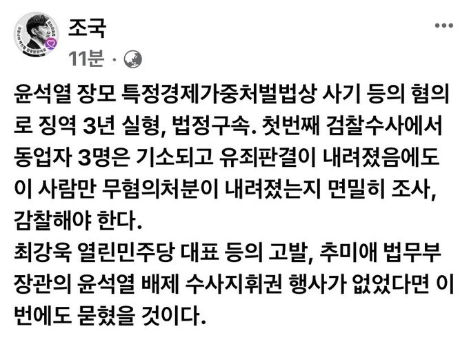 조국 전 법무부 장관은 '윤석열 장모구속'와 관련해 2일 SNS를 통해 "최강욱 열린민주당 대표 등의 고발, 추미애 법무부 장관의 윤석열 배제 수사지휘권 행사가 없었다면, 이번에도 묻혔을 것이다"라고 끔찍함을 토로했다.