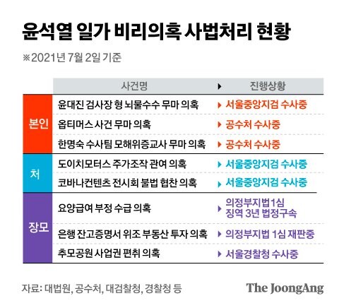 윤 전 총장의 "7가지 아킬레스건"은 장모 최 씨의 요양급여 혈세 22억 편취로 구속된 건 외에도. 첫째 본인이 관련된 '윤우진 뇌물수수 무마의혹'과 옵티머스사건 무혐의 처리 무마의혹으로 각각 서울중앙지검과 공수처에서 수사중인 2가지가 혐의가 있다.