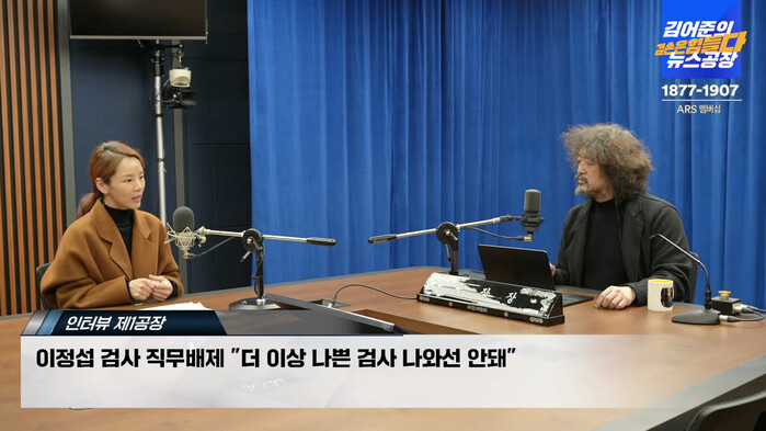 | ▲이정섭 검사의 처남댁 감미정씨와 대화중인 김어준 MC (화면 캡쳐=겸손은힘들다 뉴스공장 유튜브) |