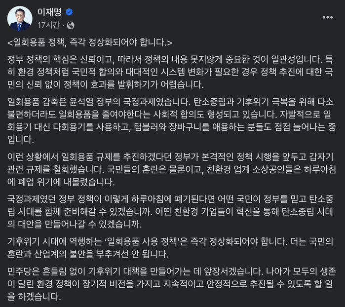 더불어민주당 이재명 대표는 18일 카페 내에서 플라스틱 빨대 사용을 금지하는 계획을 미루는 등의 정부 조치에 대해 "기후위기 시대에 역행하는 일회용품 사용 정책은 즉각 정상화돼야 한다"고 말했다.