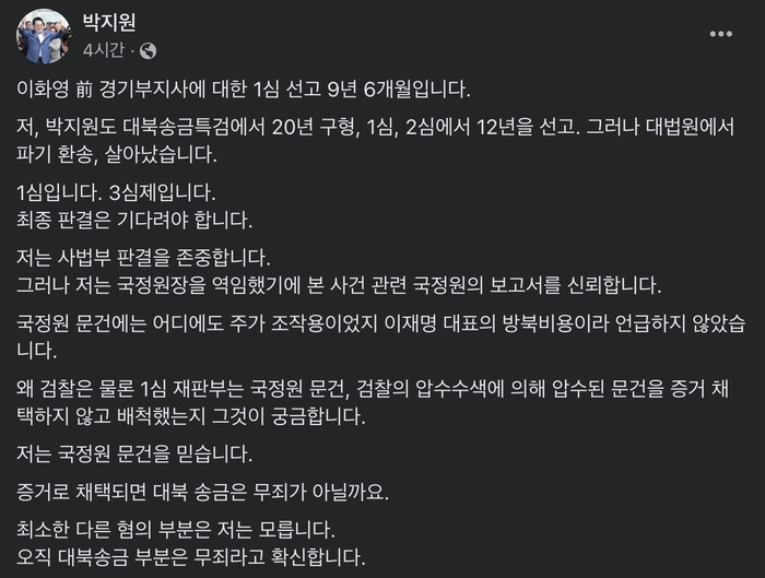 박지원 의원은 8일 페이스북 게시글에서 "이화영 전 경기부지사가 1심 선고 9년 6개월이다. 저, 박지원도 대북송금특검에서 20년 구형, 1심과 2심에서 12년을 선고, 그러나 대법원에서 파기환송, 살았났습니다"고 적었다.