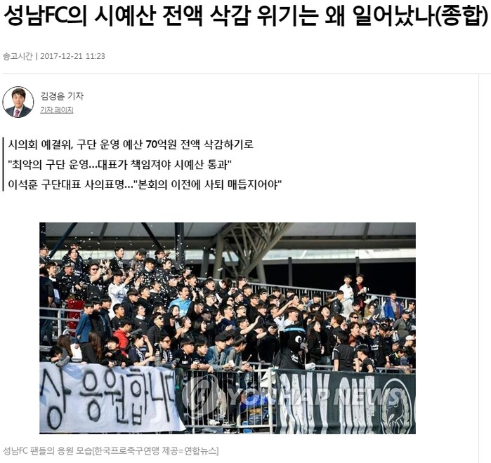 | ▲ 2017년 연합뉴스, 시의회 예산으로 운영한다는 성남FC |
