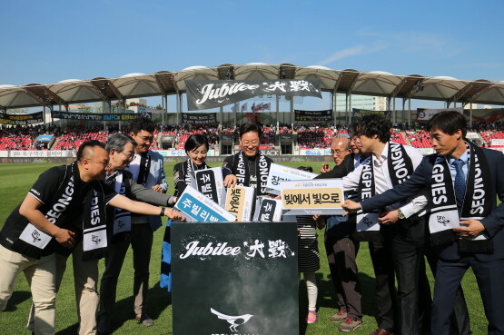 | ▲성남FC, '주빌리대전'으로 12억 기부, 주빌리 은행' 기부를 통해 장기연체 채무자들의 빚을 탕감 (2016년 5월18일 분당판교뉴스) 빚에서 빛으로. |