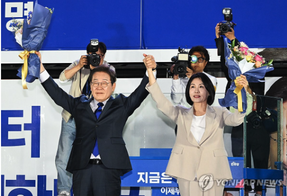 | ▲ 제21대 대통령 선거에서 당선이 확실시 되자 시민들에게 인사하는 이재명 더불어민주당 대선 후보와 김혜경 여사. 2025.6.3 (사진=연합뉴스) |